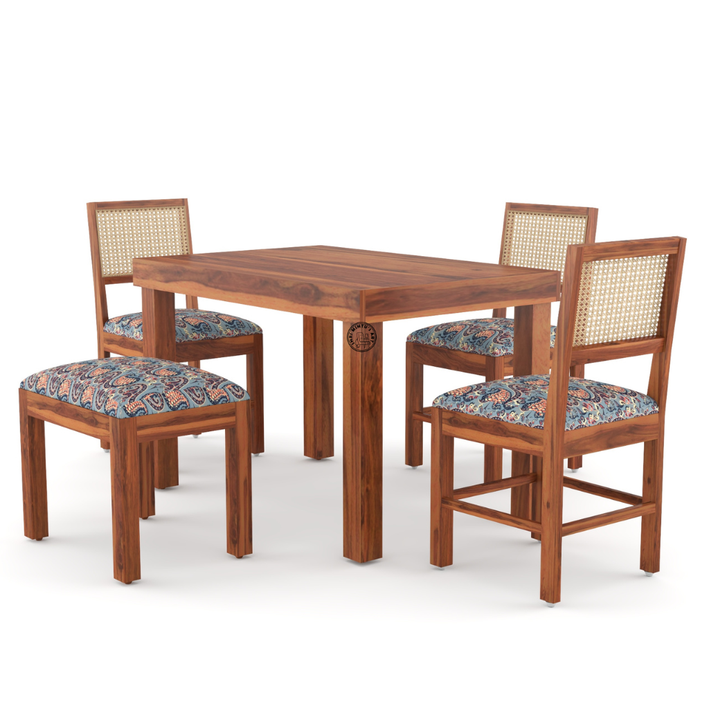 This wooden dining table set features a sturdy rectangular table with a smooth natural finish that highlights the rich wood grains. The set includes four ergonomically designed chairs with a woven cane backrest and premium cushioned seats. The chairs come with soft, stylish printed upholstery that enhances the overall look while ensuring comfortable seating for long conversations and family meals.
