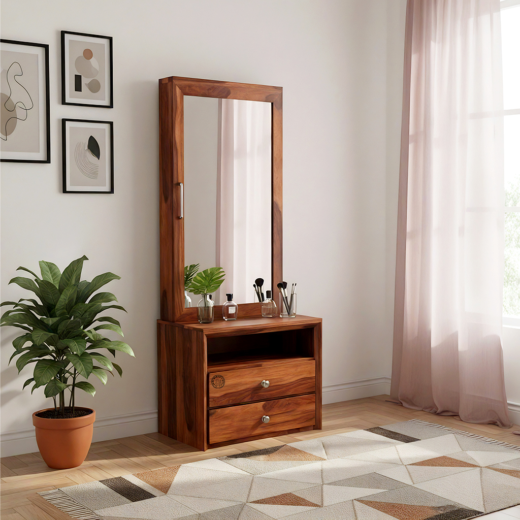 The dressing table comes with a large full-length mirror that gives you a clear view while getting ready. Its spacious tabletop provides enough space for perfumes, cosmetics, and daily essentials, while the open shelf and two smooth drawers offer organized storage for jewelry, skincare, and accessories. The natural wood grains and warm finish highlight the richness of Sheesham wood, ensuring beauty and strength that lasts for years.